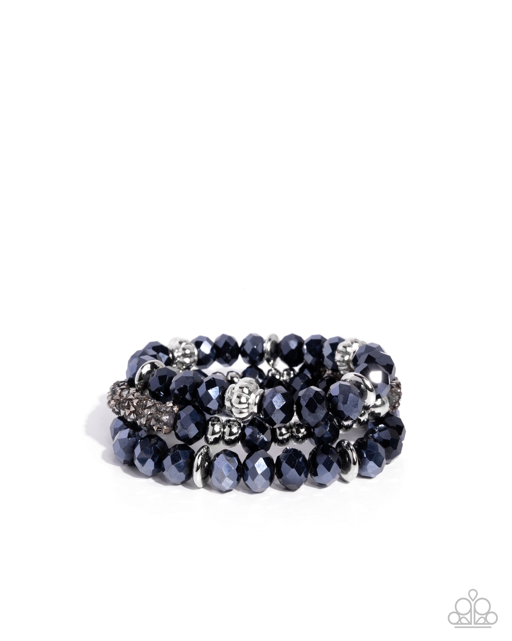 Dipped in a reflective shimmer, glittery Montana crystal-like beads, silver rings, textured silver beads, and curved accents exploding with hematite rhinestones are threaded along elastic stretchy bands around the wrist for a stellar showcasing stack.