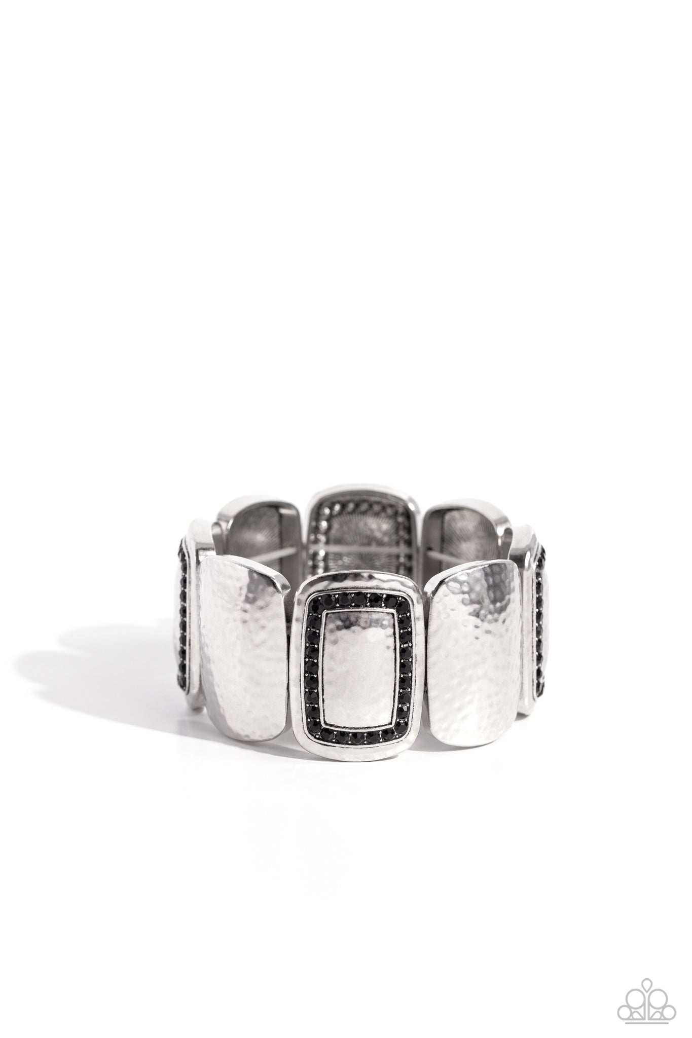 Infused with framed black rhinestones, delicately hammered concaved silver discs alternate with plainly hammered concaved silver discs around the wrist along a stretchy band for a gritty glamorous look.