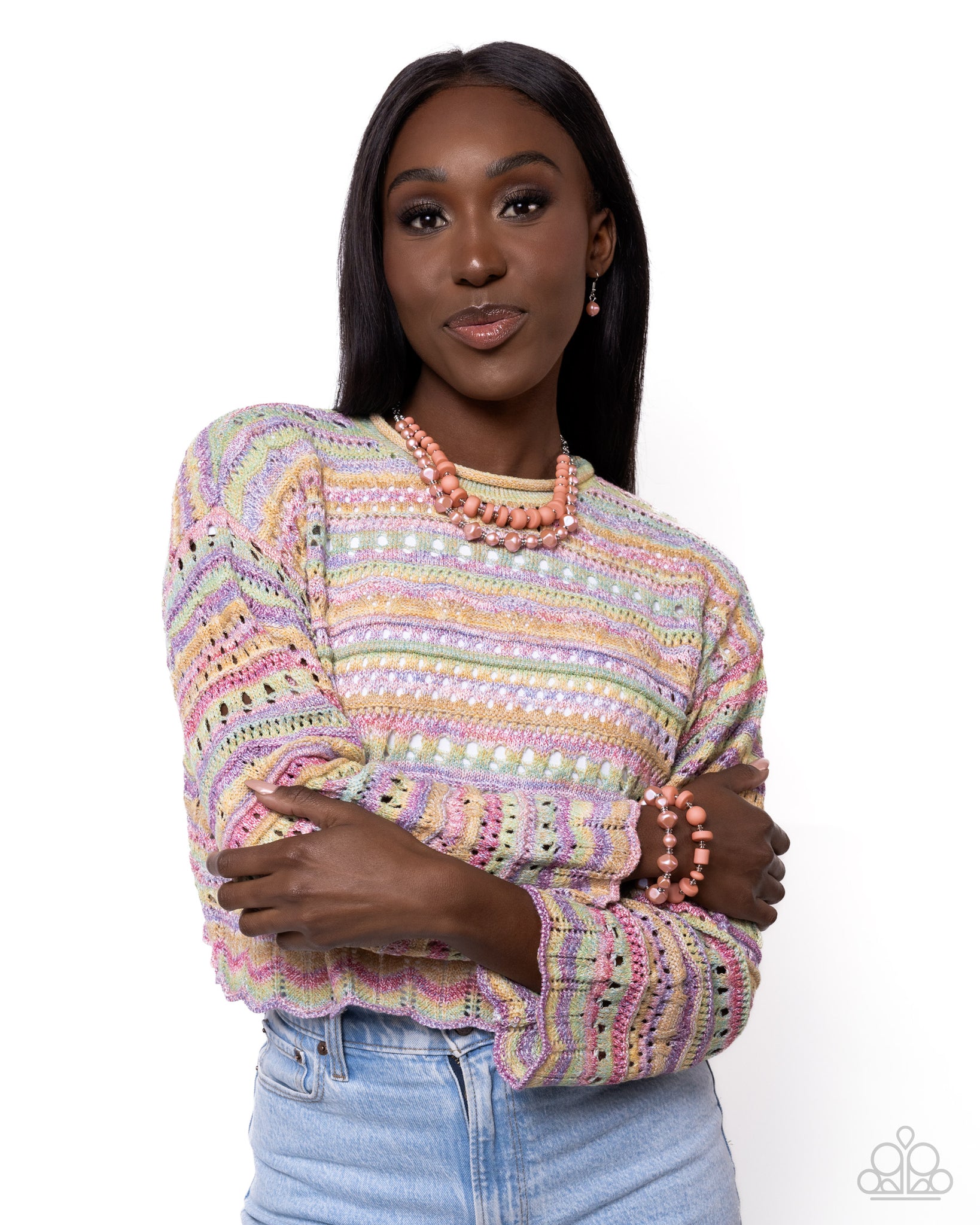 A collection of Desert Flower acrylic beads that alternate with silver beads is stretched across an elastic stretchy band. Joining the acrylic strand, sheared Desert Flower beads brushed with an iridescent sheen also alternate with silver beads along an elastic stretchy band completing a layered, luminescent look. Due to its prismatic palette, color may vary.