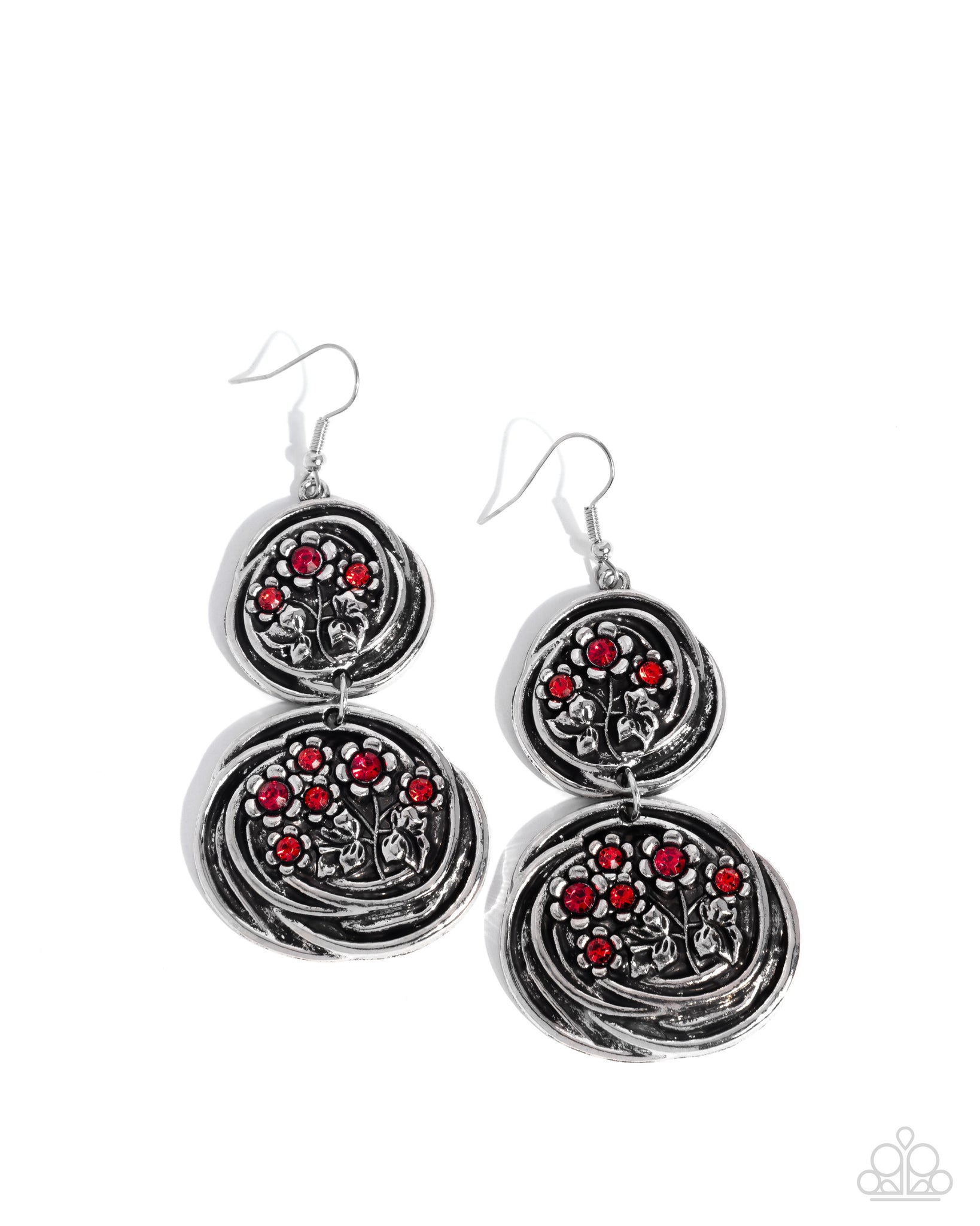 Sparkling red rhinestones are sprinkled along dainty silver bouquets, blooming atop swirl-textured mismatched silver discs radiating with whimsical leafy texture. Earring attaches to a standard fishhook fitting.