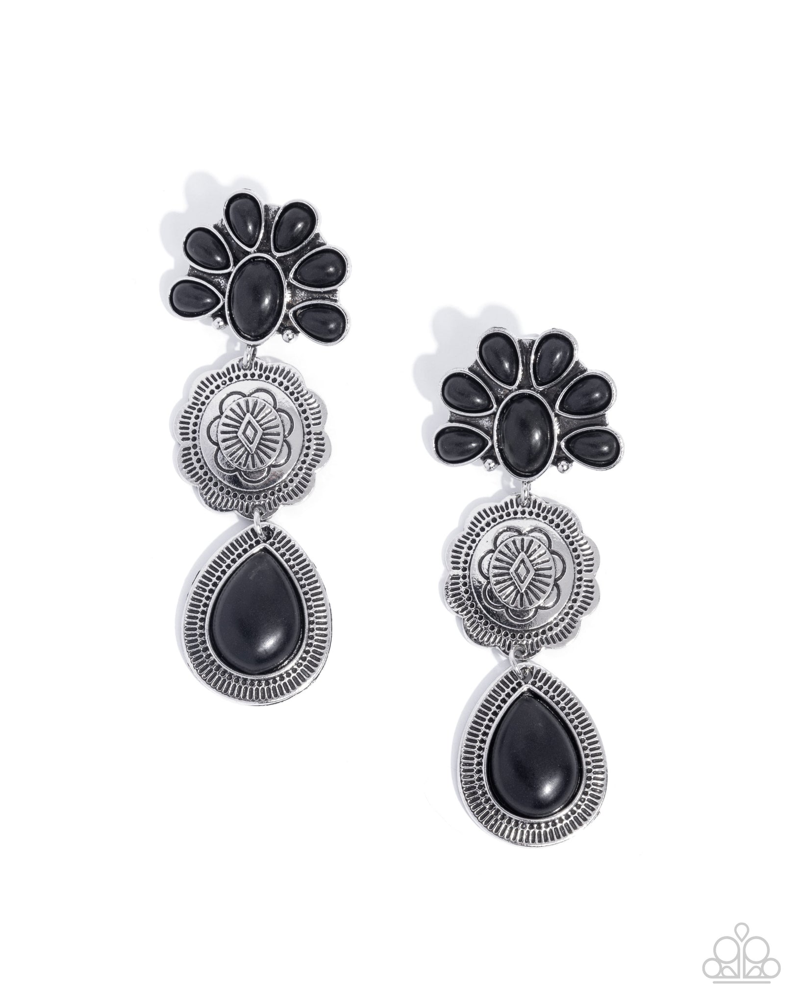 Oval and teardrop-shaped black stones are pressed into ornate silver frames, creating a dramatic cascade of textures and contrasts. Dotted and embossed details enhance the silver settings, adding a touch of vintage flair to the bold design. Earring attaches to a standard post fitting.
