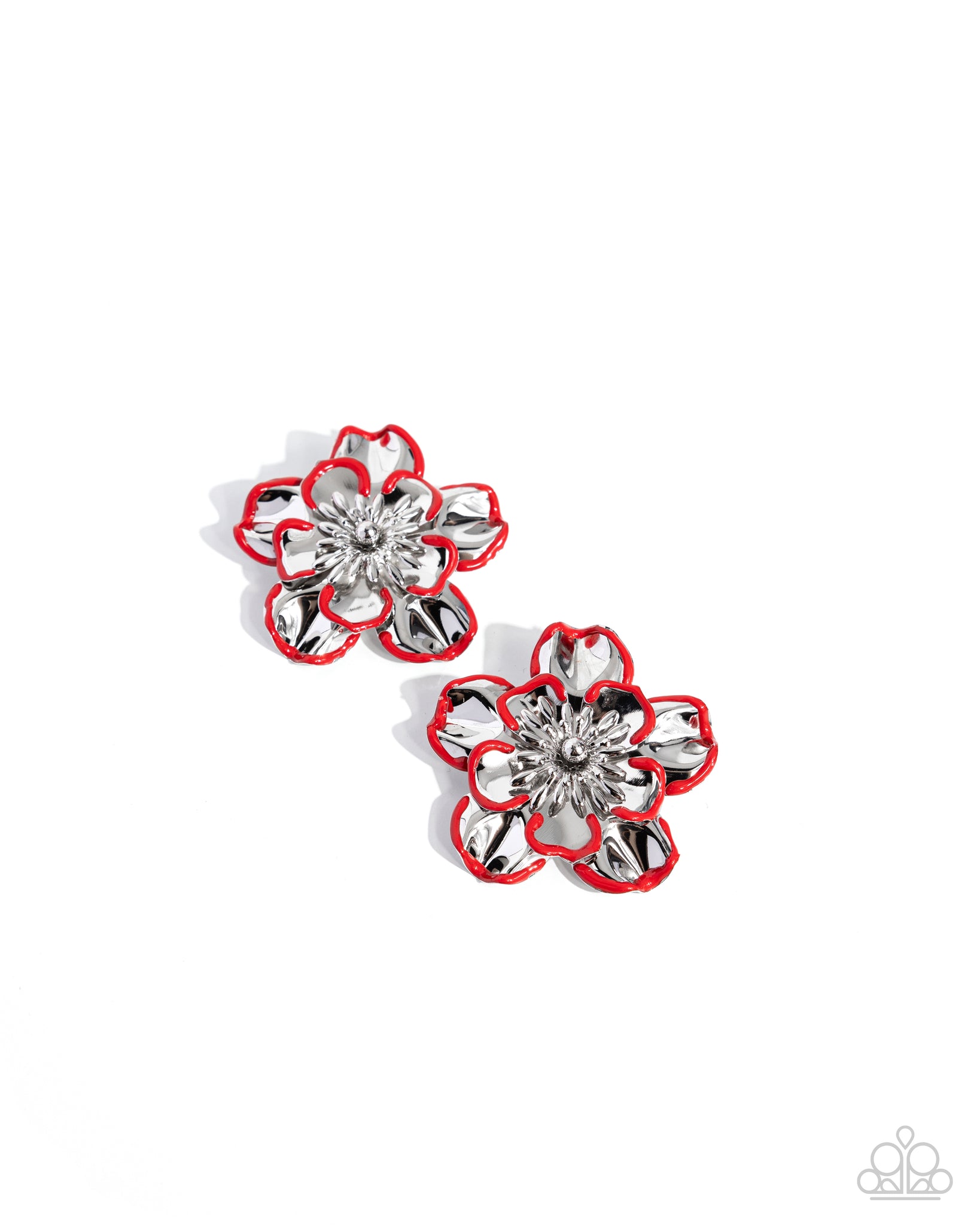 Etched in red framing, three-dimensional warped silver flowers stack atop one another for a whimsically feminine display. Earring attaches to a standard post fitting.