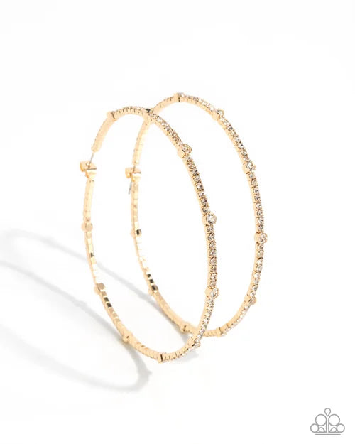 Sporadically interrupted by white rhinestones in rounded gold fittings, a collection of white rhinestones in gold square fittings is infused along an oversized gold wire hoop for a sensationally eye-catching display. Earring attaches to a standard post fitting. Hoop measures approximately 3" in diameter.