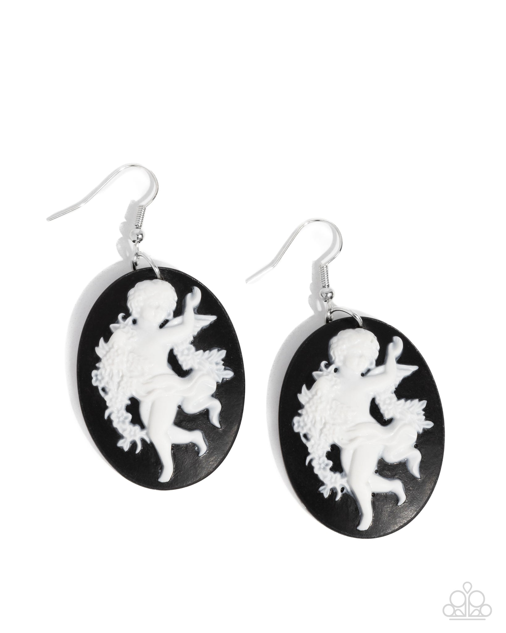 Modeled after cameo earrings, a white acrylic cherub poses atop a black-painted glistening oval for a vintage vibe below the ear. Earring attaches to a standard fishhook fitting.