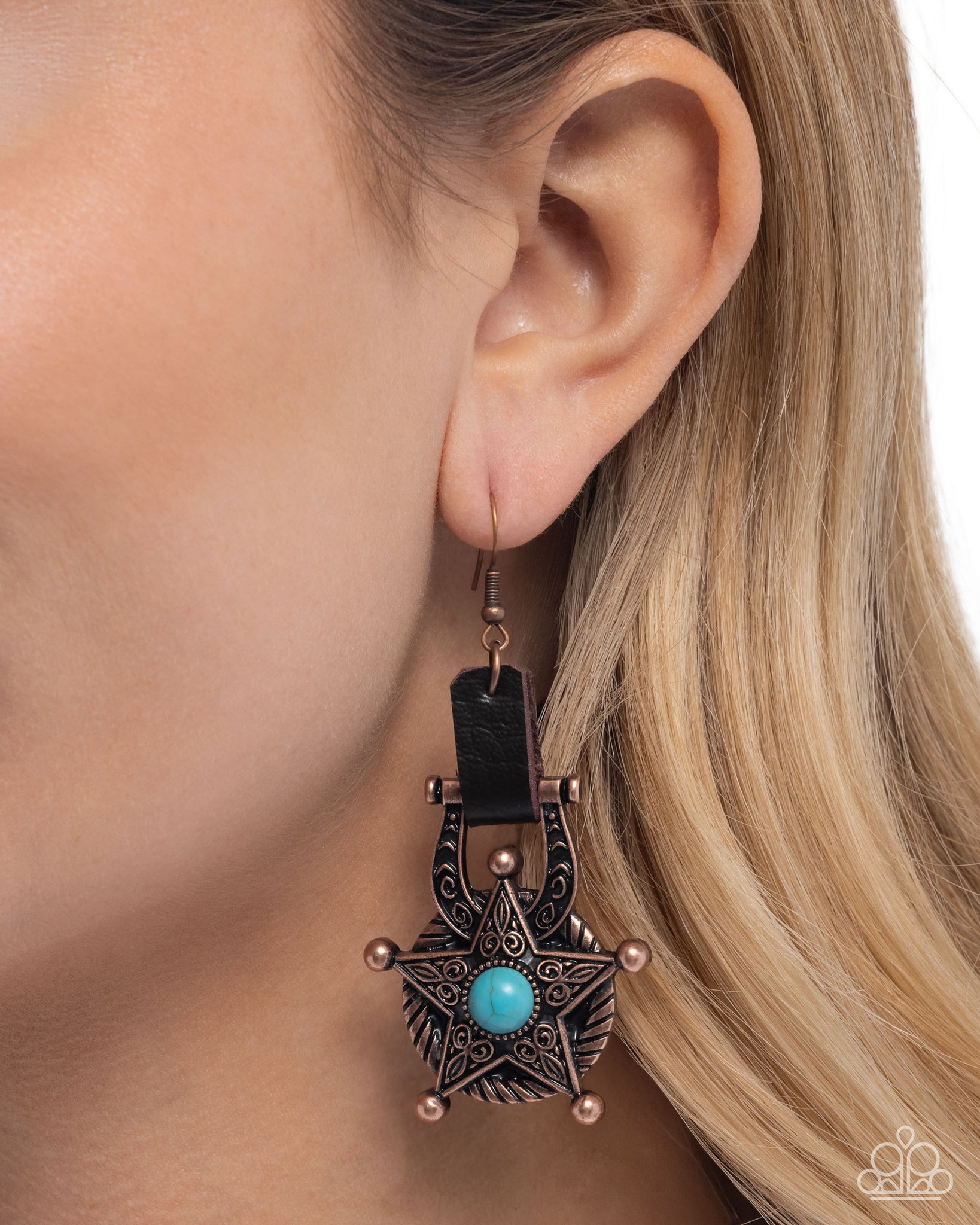Featuring a strip of brown leather, a decorative copper stirrup gives way to an equally decorative copper sheriff's star pendant with a turquoise stone centerpiece and copper studs along each star's points for a whimsically Western lure. Earring attaches to a standard fishhook fitting. As the stone elements in this piece are natural, some color variation is normal.