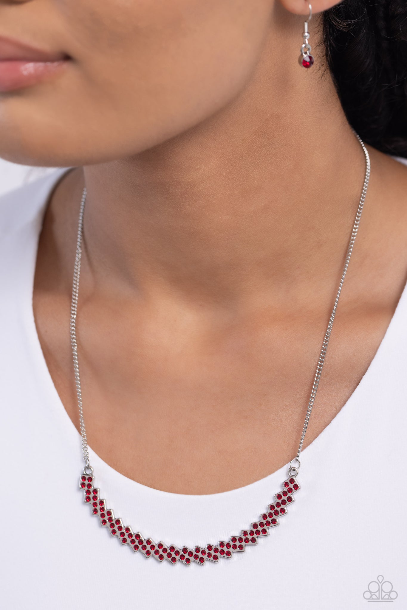 Dotted with fiery red rhinestones, dainty silver frames slant below the collar as they coalesce into a single curving centerpiece of dicey dazzle. Features an adjustable clasp closure.