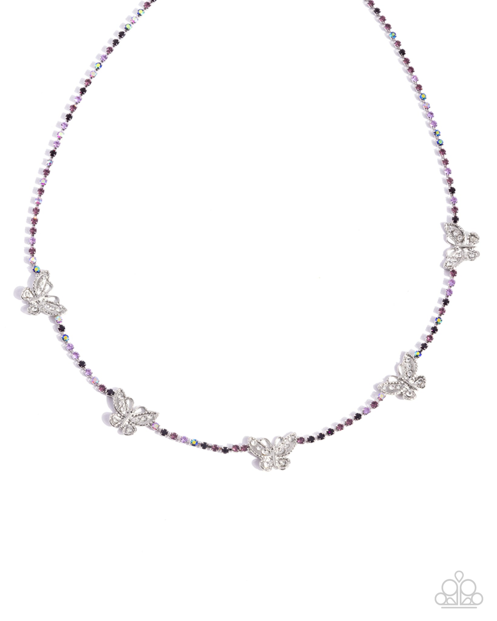 Infused along a row of dainty amethyst, violet iridescent, light amethyst, violet, and amethyst iridescent rhinestones pressed into silver box-chain settings, a collection of silver butterflies coalesces around the neckline for a whimsical finish. Each butterfly features a dainty shimmer of white rhinestones on its wings, for a sparkly statement. Features an adjustable clasp closure. Due to its prismatic palette, color may vary.