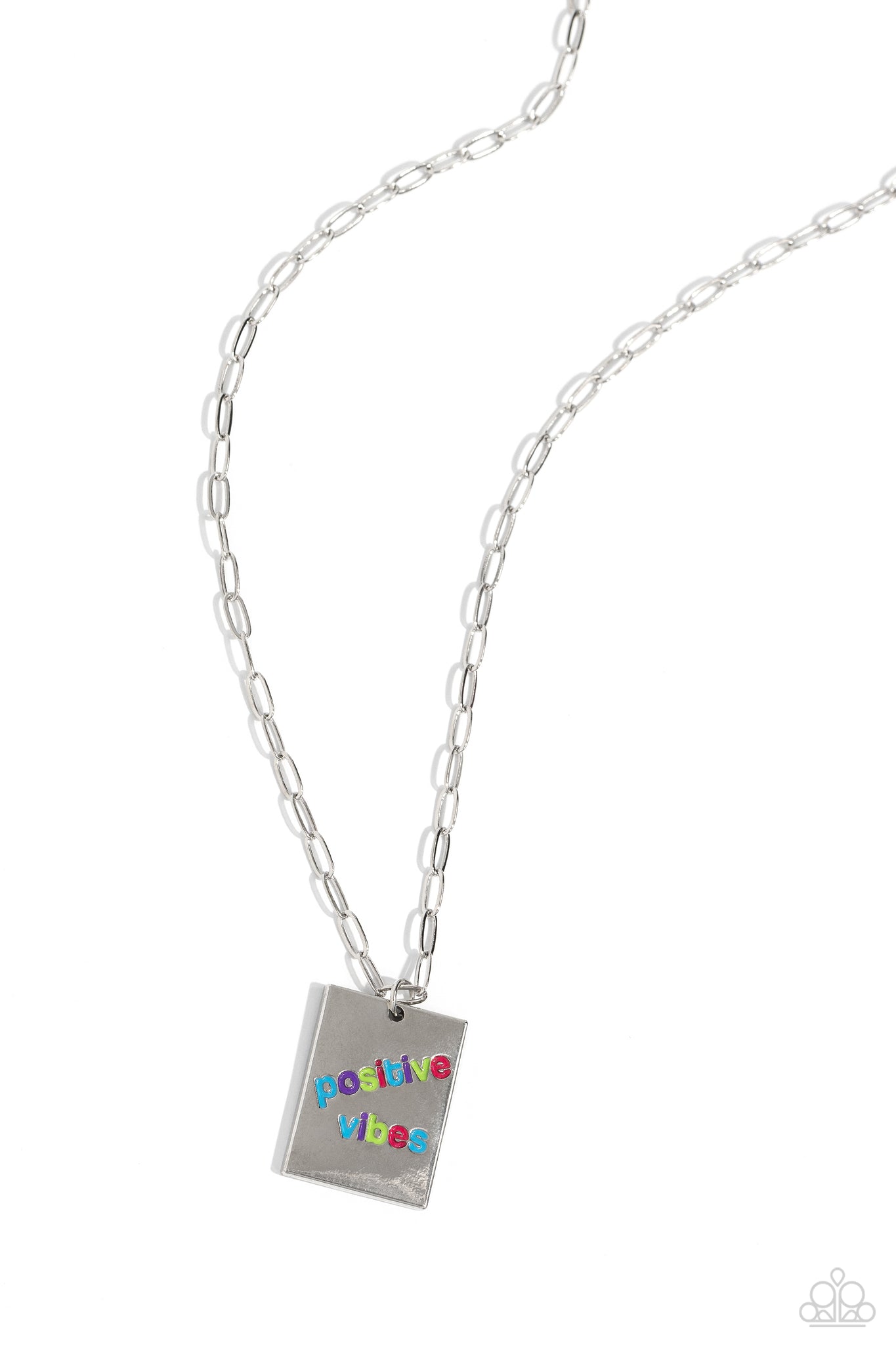 A rectangular silver pendant is stamped with the phrase "positive vibes" in a vibrant multicolored font at the bottom of a trendy, dainty silver paperclip chain, creating an inspiring pendant below the collar. Features an adjustable clasp closure.