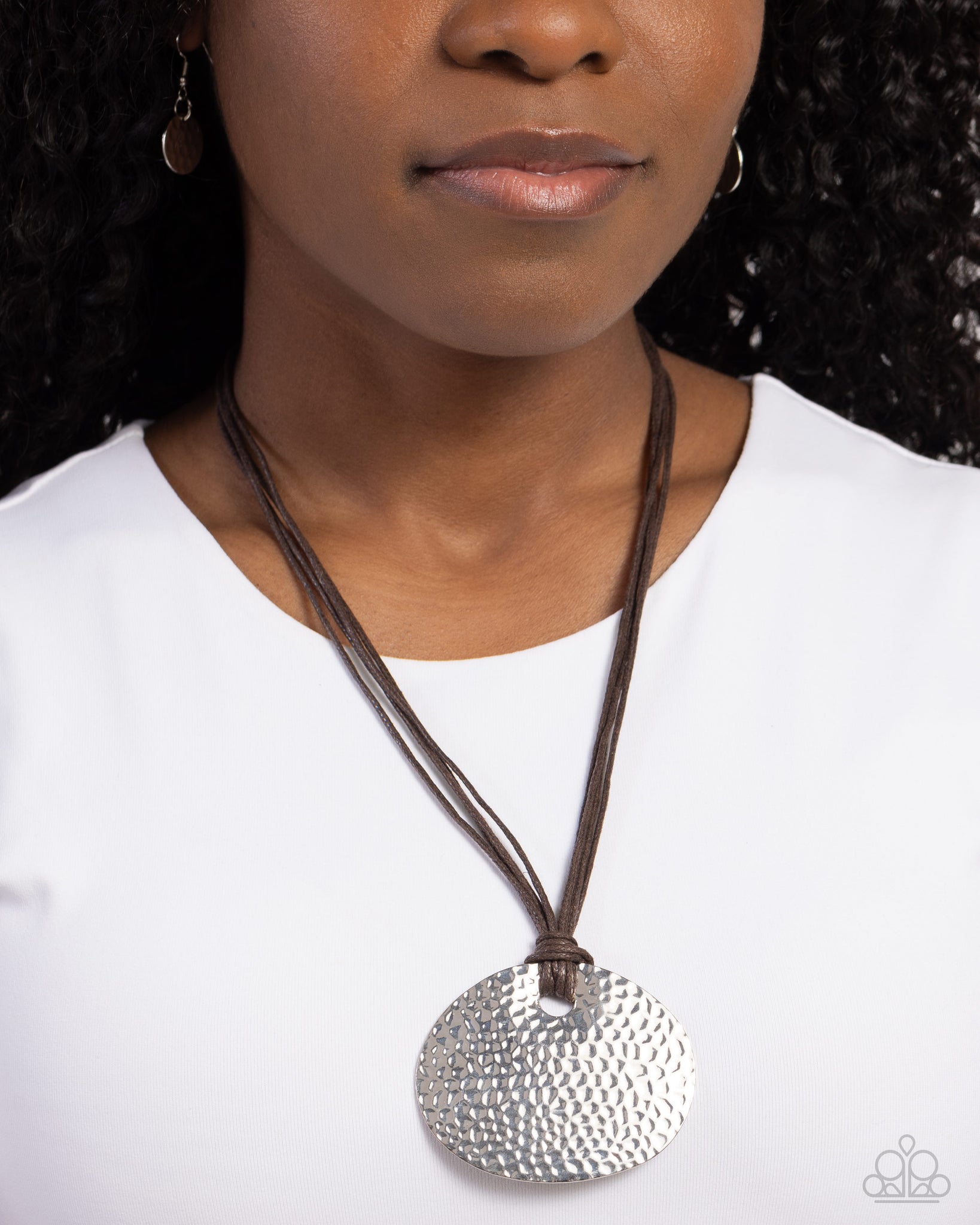 A meticulously hammered silver frame is knotted in place with brown cording, invoking an artisan inspired aesthetic. Features an adjustable clasp closure.