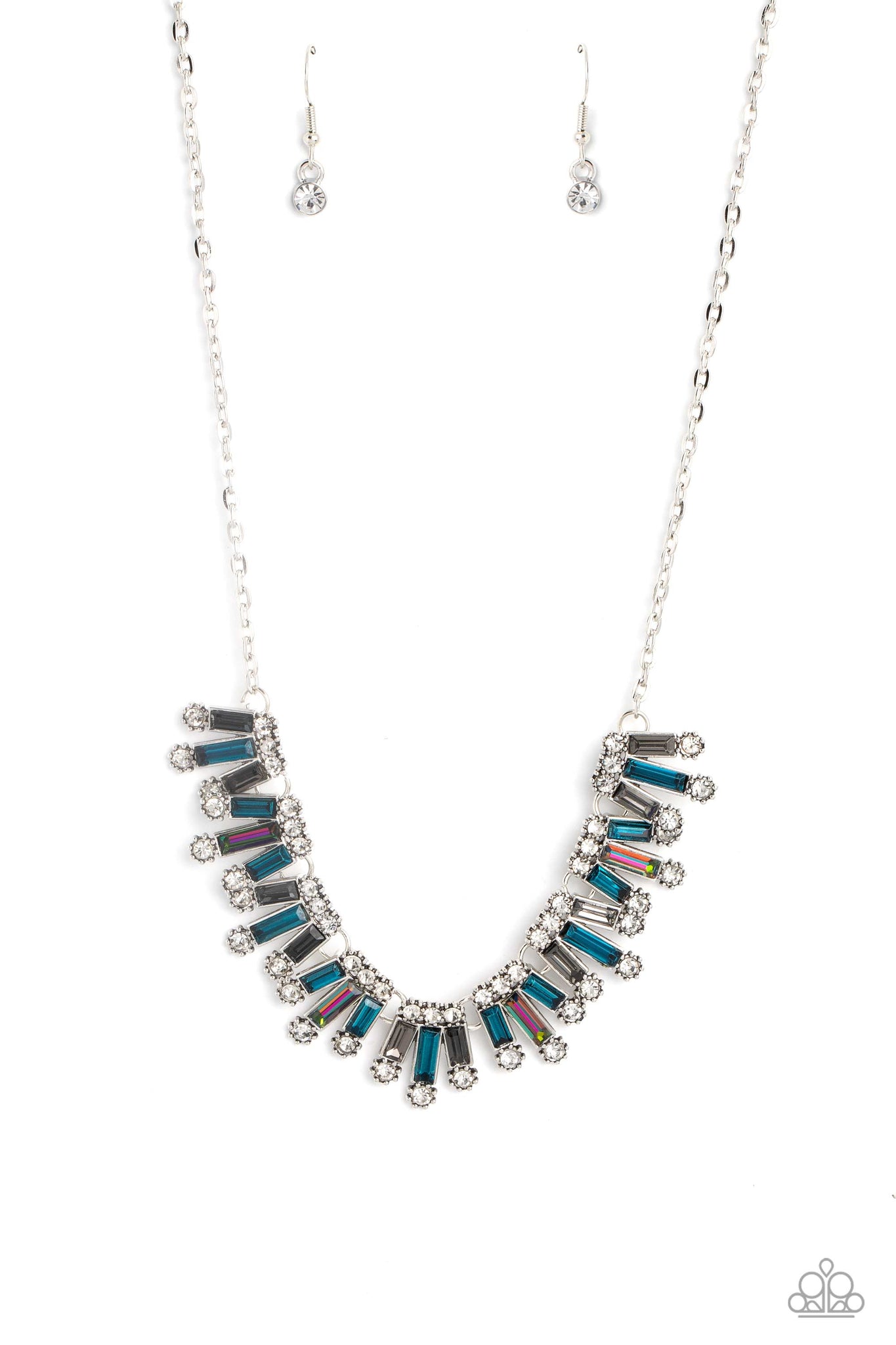 Set in clusters around the neckline, a collection of shiny multicolored bars with a reflective finish glimmer. Dainty white gems, pressed into silver sun-studded frames, border the tops and bottoms of the colorful bars for additional glitz in the industrial, statement piece. Features an adjustable clasp closure.