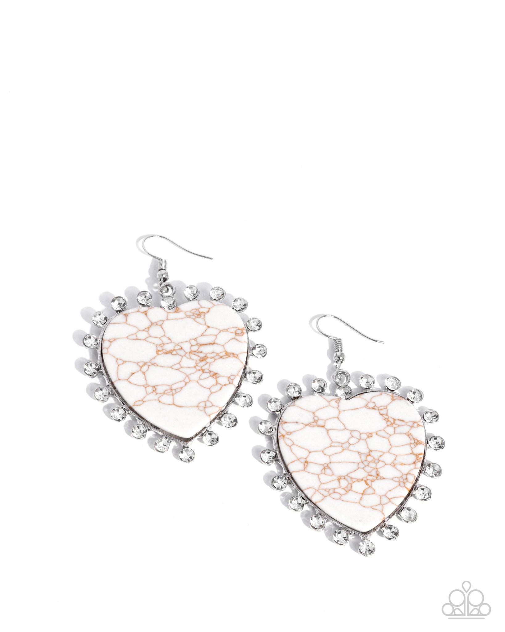 Featuring a border of dazzling white rhinestones, an oversized marbled white heart stone sways below the ear for a radiantly rustic lure. Earring attaches to a standard fishhook fitting. As the stone elements in this piece are natural, some color variation is normal.