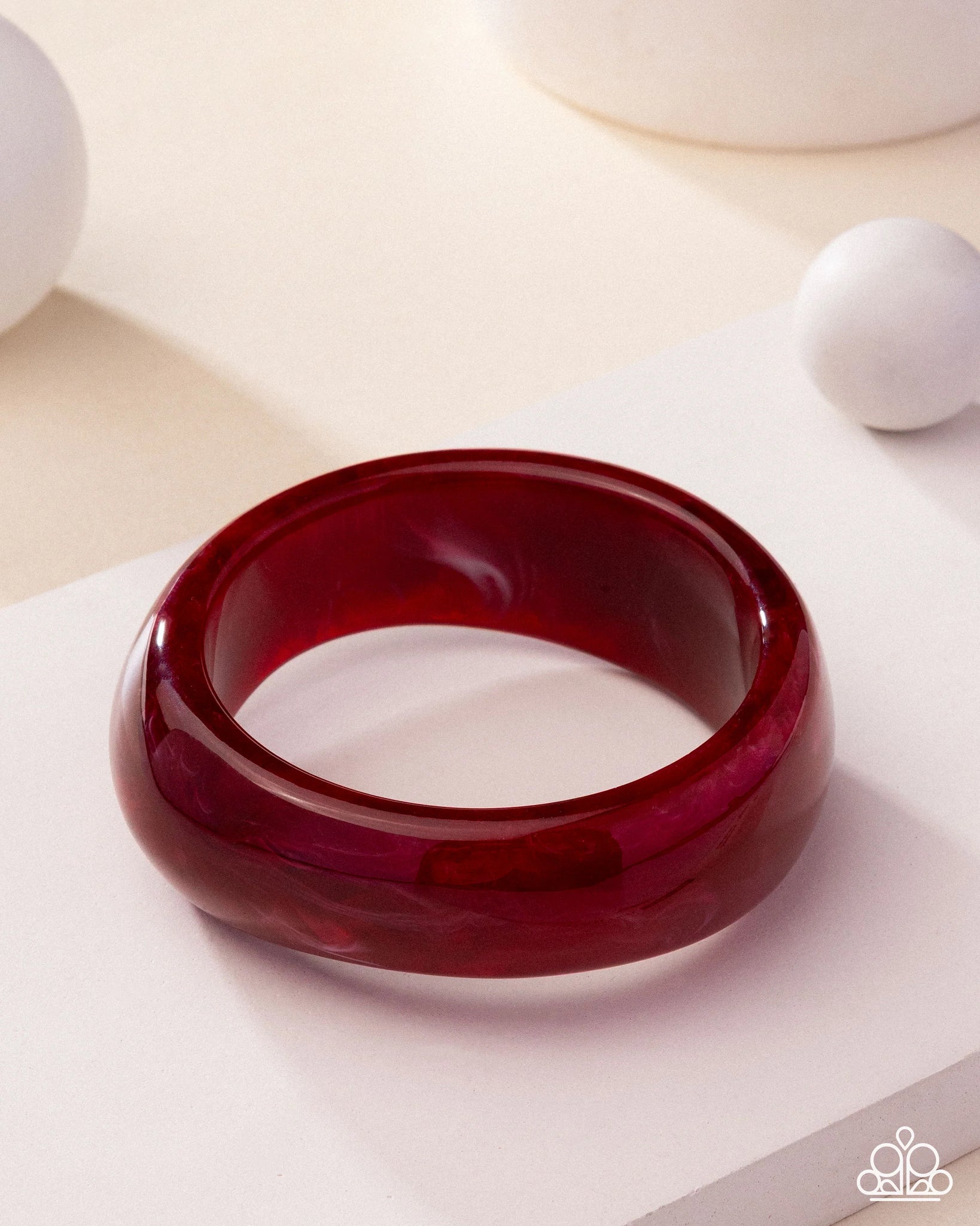 Featuring a mesmerizing swirled motif, a dramatically oversized red acrylic bangle slides along the wrist for a trendy pop of color.