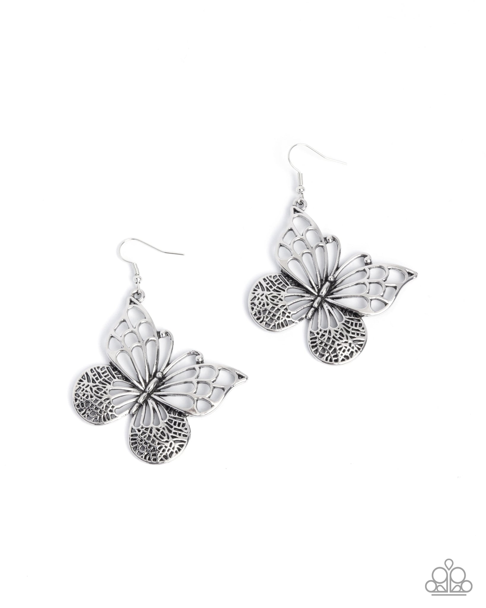 Featuring filigree in a variety of textures, an airy silver butterfly with studded detail flutters below the ear for a whimsical lure. Earring attaches to a standard fishhook fitting.