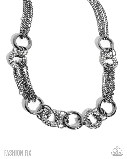 Featuring a gunmetal finish, a collection of thick, sleek rings alternating with rows of white rhinestone-embellished rings patterns around the neckline for an elegantly edgy display. Strands of copious gunmetal chains and duos of gunmetal clasp rings are sporadically infused along the design for additional dominant detail. Features an adjustable clasp closure.