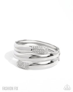 Dusted in white rhinestones along its ends, a curly silver cuff elegantly slithers along the wrist for a luminescent layered look. Features a hinged closure.