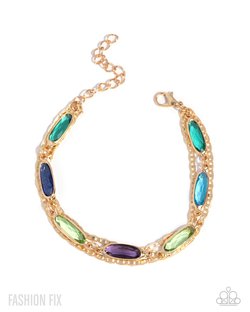 Featuring a mix of dainty textured and cable gold chains, a row of faceted, transparent multicolored acrylic oval beads encased in sleek gold frames joins the eclectic pattern, reflecting light with every movement for a chic, dimensional centerpiece. Features an adjustable clasp closure.