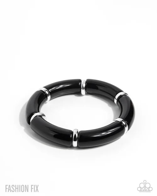 Infused along an elastic stretchy band, a collection of silver discs alternates with polished curved black acrylic beads along the wrist for a remarkably rustic look.