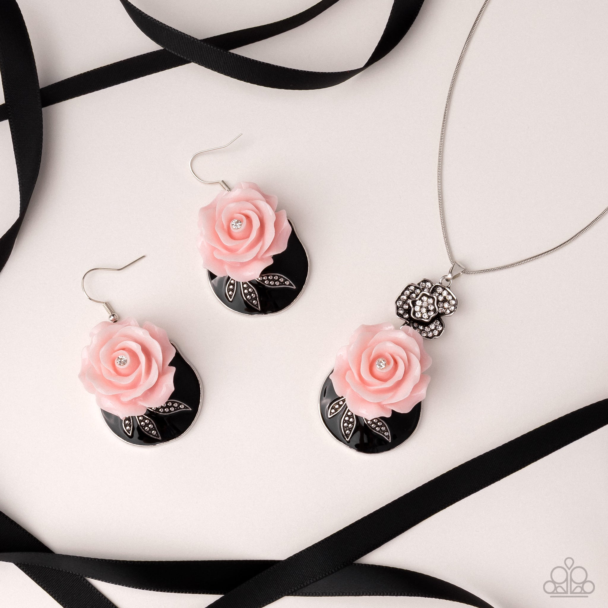 Gliding along a silver snake chain, a white rhinestone-dotted silver rose gives way to a three-dimensional light pink acrylic rose with a solitaire white rhinestone centerpiece that blooms in front of a black-painted pendant complete with a trio of textured leaves for an over-the-top whimsical display. Features an adjustable clasp closure.