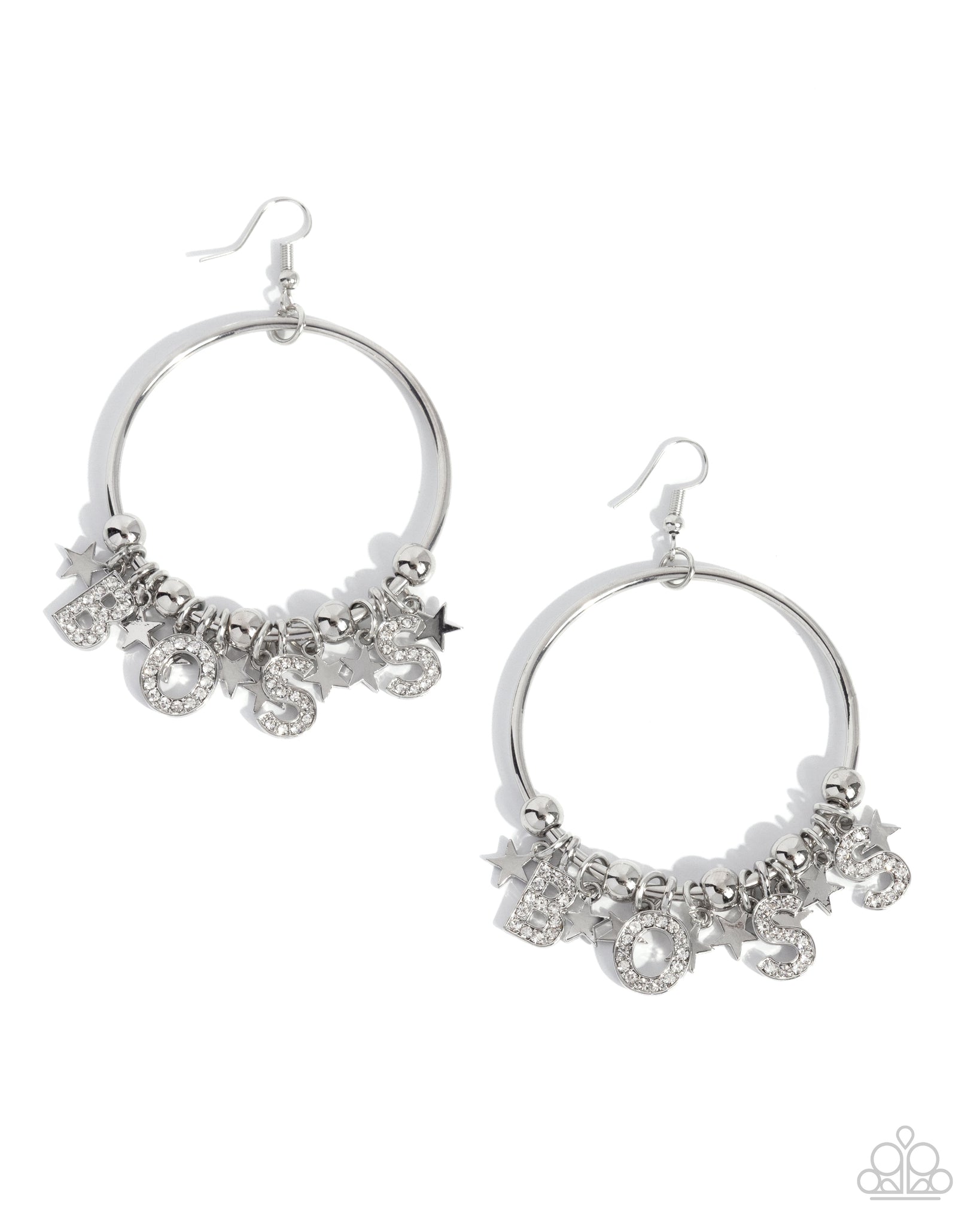 An abundance of miniature shiny silver rings, beads, silver stars, and silver letters dusted in white rhinestones that spell out the word "BOSS" slide around a simple silver front-facing hoop, resulting in a polished corporate vibe. Earring attaches to a standard fishhook fitting.