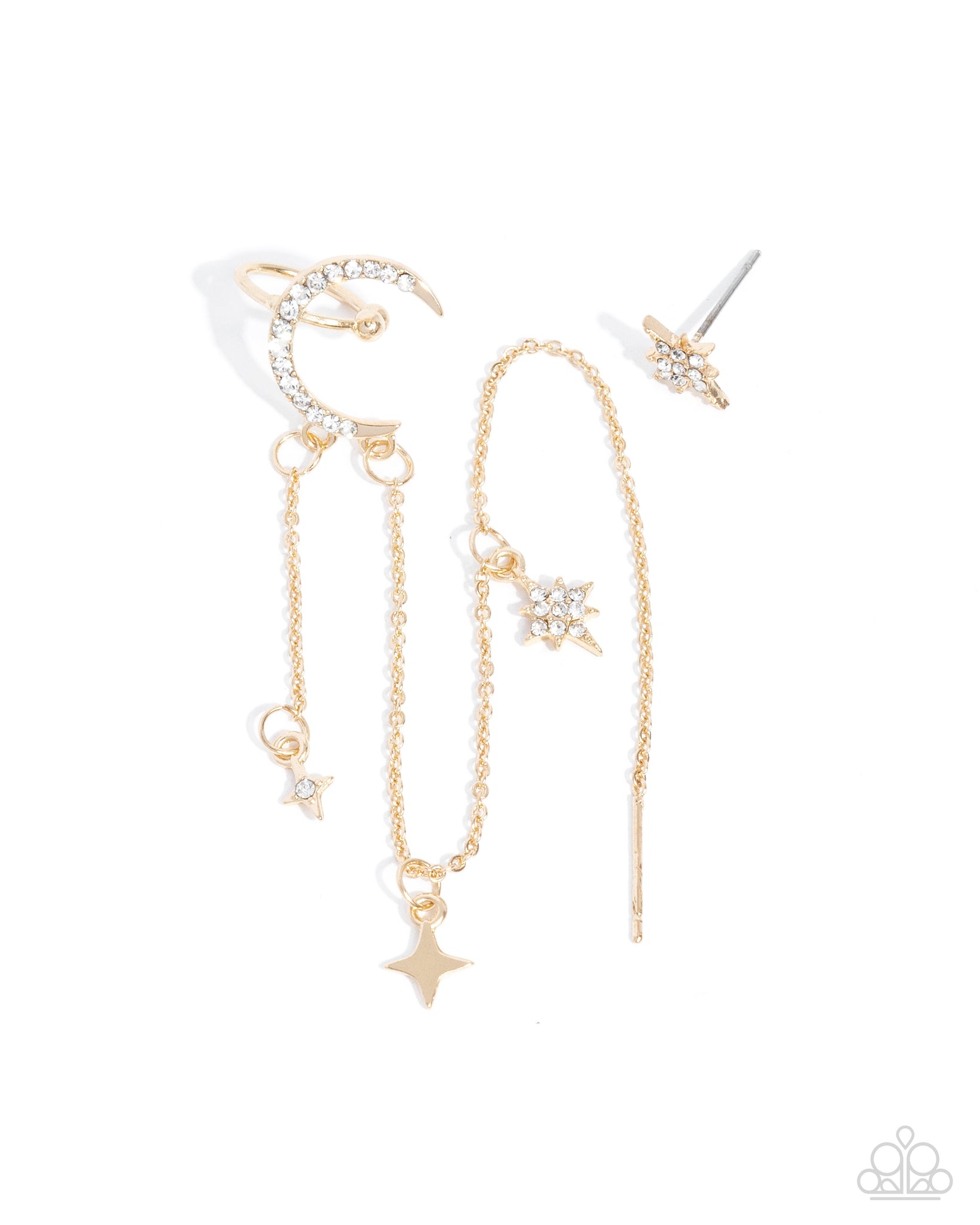 A white rhinestone-encrusted gold crescent moon gently shimmers atop the ear on a gold barbell cuff, creating a stunning statement. A collection of gold stars is attached to a dainty gold classic chain that extends below the lunar cuff, attaching to a thin gold threading cap fitting for the ability to weave along the ear across multiple piercings for a cosmically chic look. A three-dimensional gold star dusted in white rhinestones stands out as a solitaire post for the other earring for a magically, mismatched look.