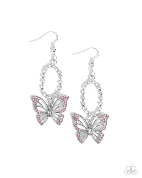 Pressed in silver square fittings, a strand of glistening white rhinestones forms into an opulent oval that gives way to a pink rhinestone-embellished airy silver butterfly for a whimsical lure. Earring attaches to a standard fishhook fitting.