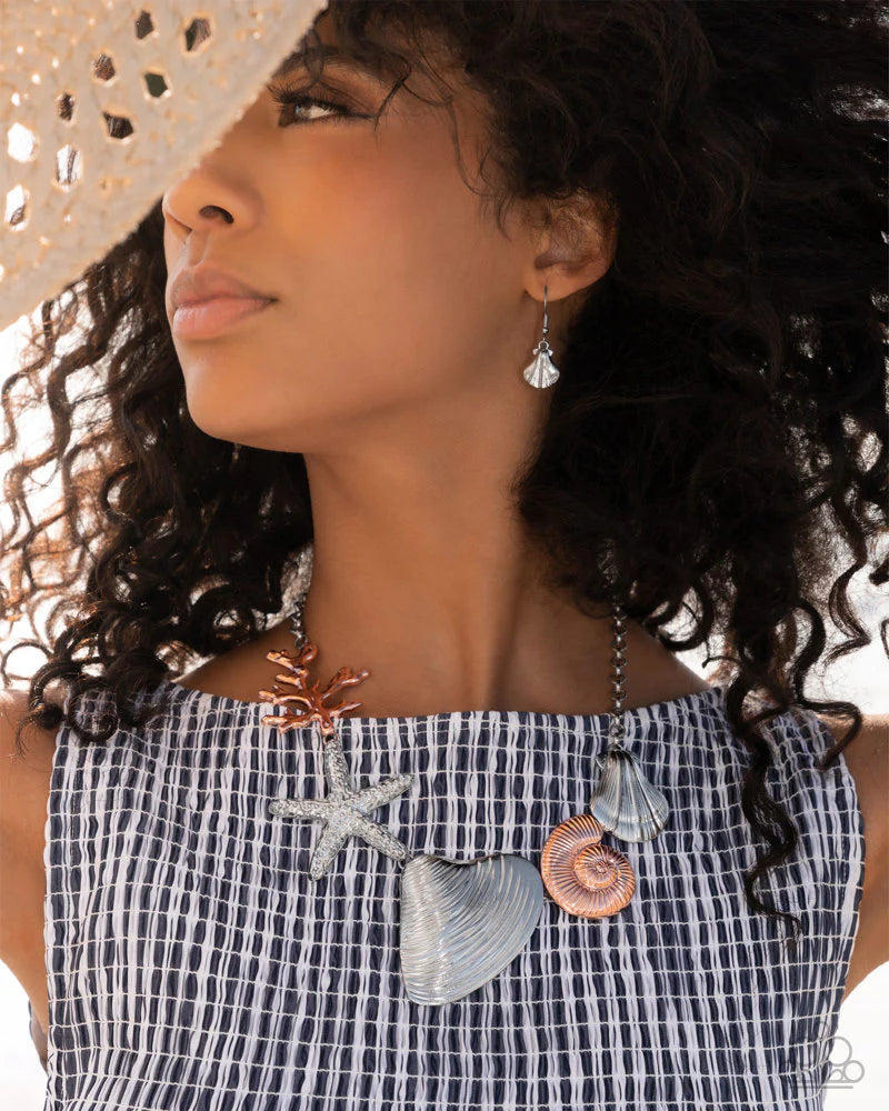 Antiqued silver and shiny copper accents come together to create a seaside-inspired masterpiece. A textured shiny copper coral piece, a dotted starfish, and various shell designs alternate along the neckline, exuding coastal charm. Features an adjustable clasp closure.