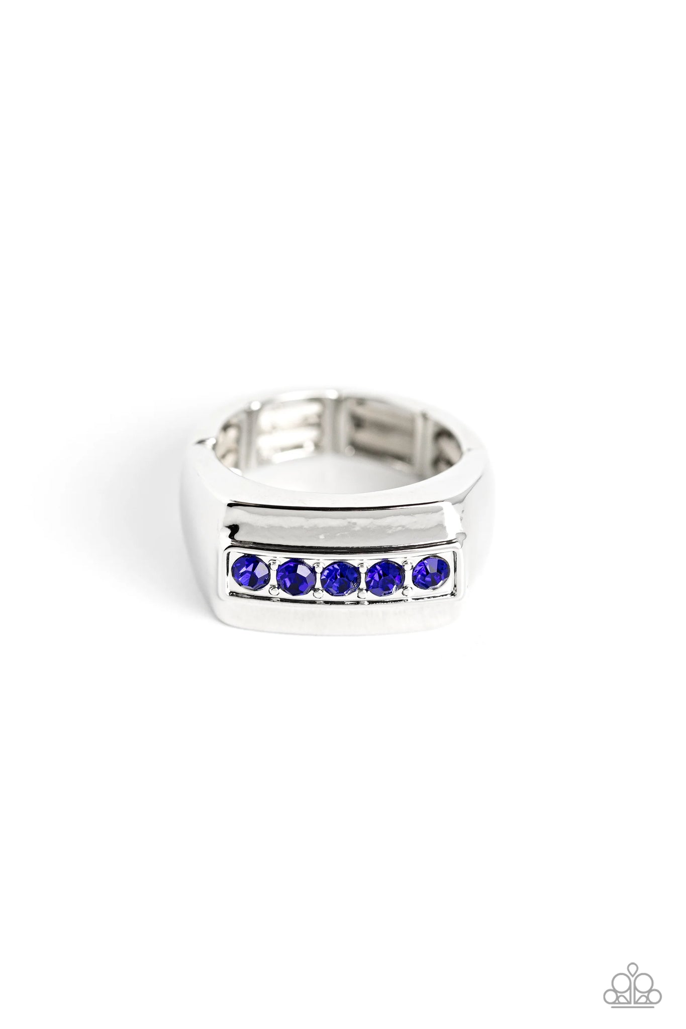 A single row of glassy sapphire rhinestones and silver studs is encrusted along the center of a thick rectangular silver band for an understated pop of color atop the finger. Features a stretchy band for a flexible fit.