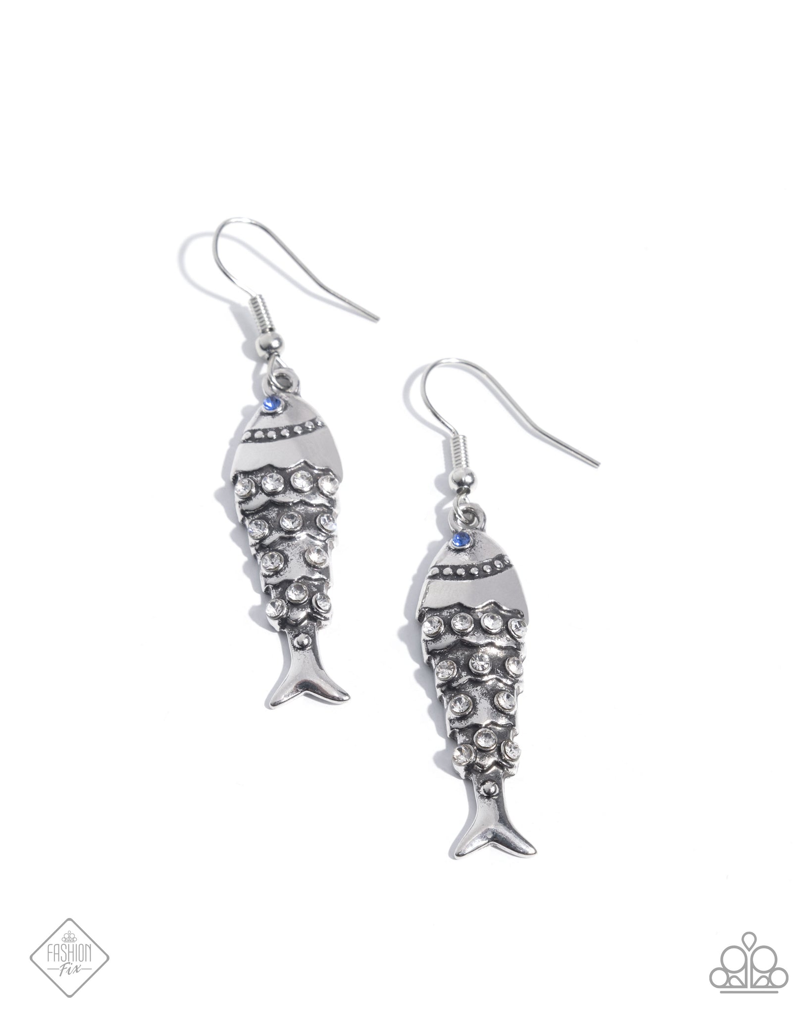 Featuring a sapphire rhinestone eye, a silver fish with silver-studded details and white rhinestone scales swims below the ear for a uniquely upstream lure. Earring attaches to a standard fishhook fitting.