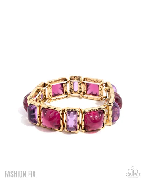 Pressed in hammered, gold rectangular and square frames, an abstract, glassy collection of Lavender and Damson acrylics alternate and link around the wrist on elastic stretchy bands for a colorfully classic look.