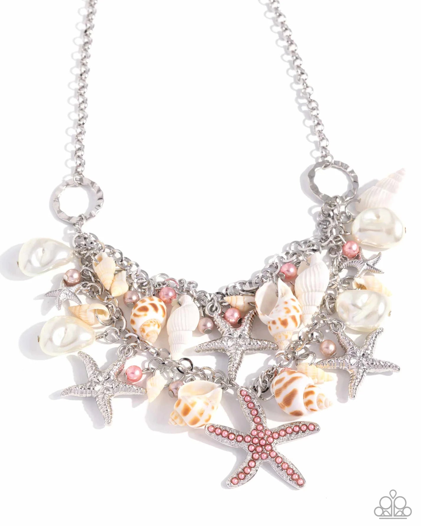 An eclectic display of shimmery silver texture and beach-inspired accents gathers along layered, thick, silver links, creating a boisterous display along the neckline. The hodgepodge of texture and sheen includes textured silver starfish, baroque white pearls, white seashells, Desert Flower pearls, a Desert Flower pearl-encrusted silver starfish, and hammered silver rings. Features an adjustable clasp closure.