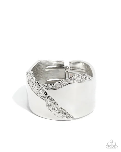 Asymmetrically cutting across the front and sides of a chunky, silver cuff, an explosion of silver studs and white crystal-like rhinestones intercede along the wrist for an abstract, unapologetic look. Features a hinged closure.