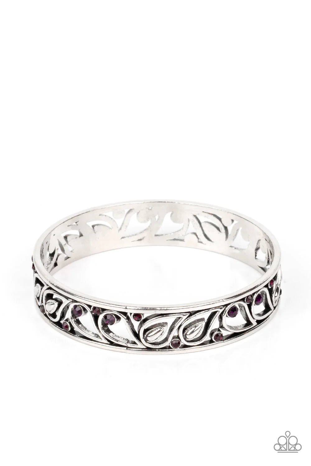 A dainty collection of glittery amethyst rhinestones are sprinkled across a collage of a paisley-inspired silver pattern that delicately coalesce into an airy bangle around the wrist, creating a shimmery seasonal centerpiece.