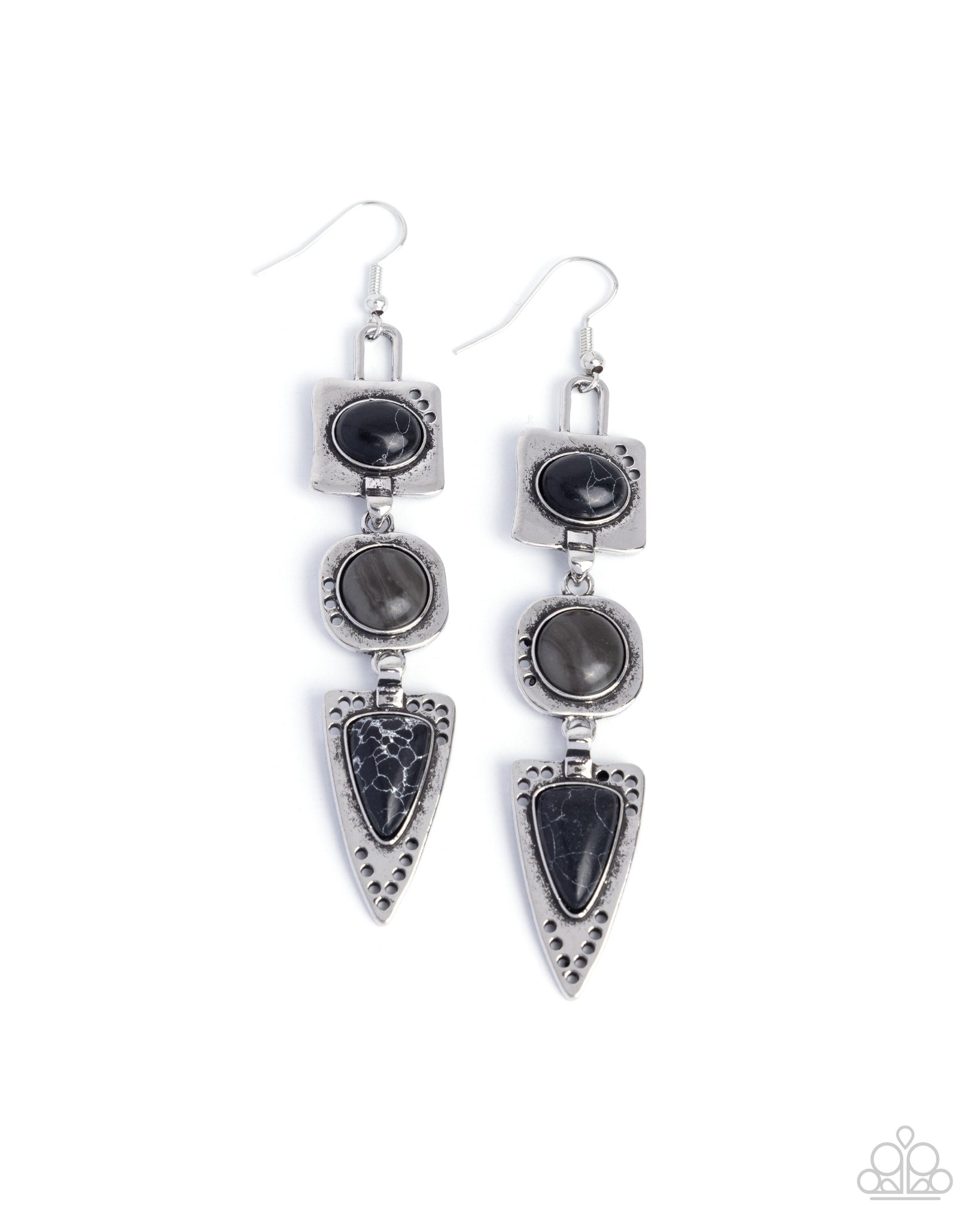 Featuring a stacked design of textured silver frames, natural marbled black and gray round and triangular stones swing from the ear. The geometric arrangement of square, round, and triangular shapes creates a unique and artistic look. Earring attaches to a standard fishhook fitting. As the stone elements in this piece are natural, some color variation is normal.