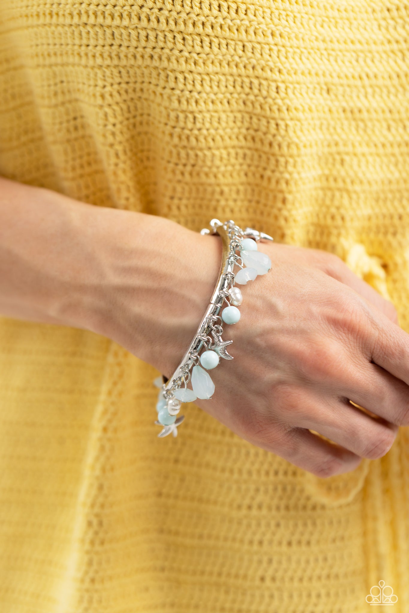 Glassy Skylight beads in various shapes, opaque Skylight beads, dainty baroque pearls, and silver starfish charms elegantly drip along silver frames stretched together on elastic stretchy bands around the wrist, creating a beach-clustered display.