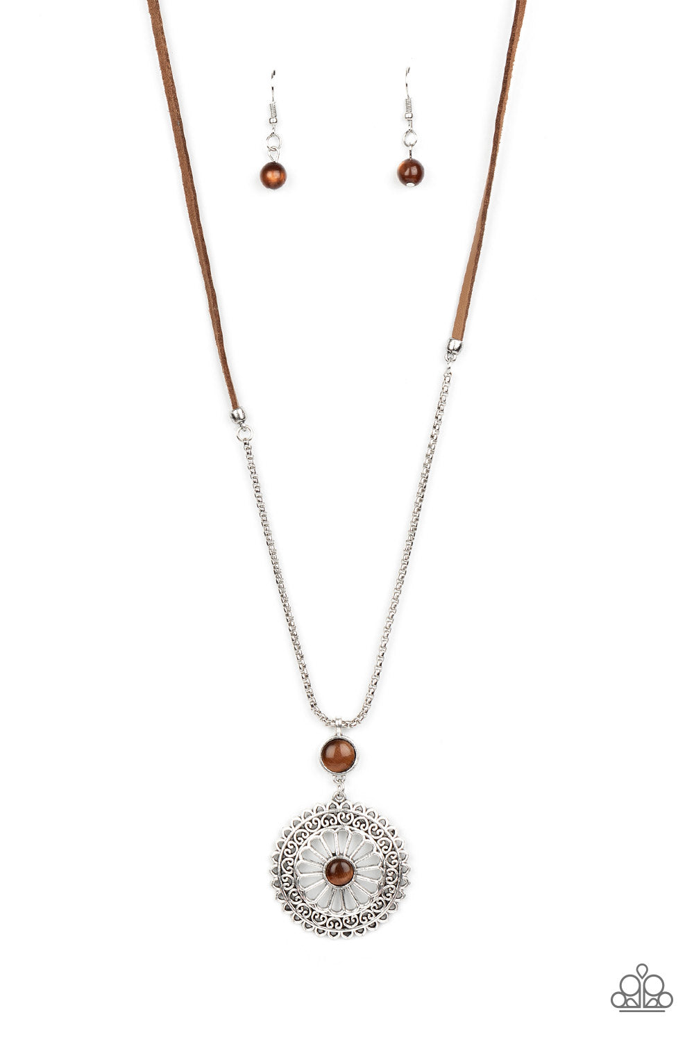 Attached to a section of shiny silver box chain, a frilly silver mandala-like pendant swings from the bottom of pieces of brown suede. Glowing brown cat's eye stone accents adorn the whimsical frame for a colorfully, earthy finish. Features an adjustable beaded closure.