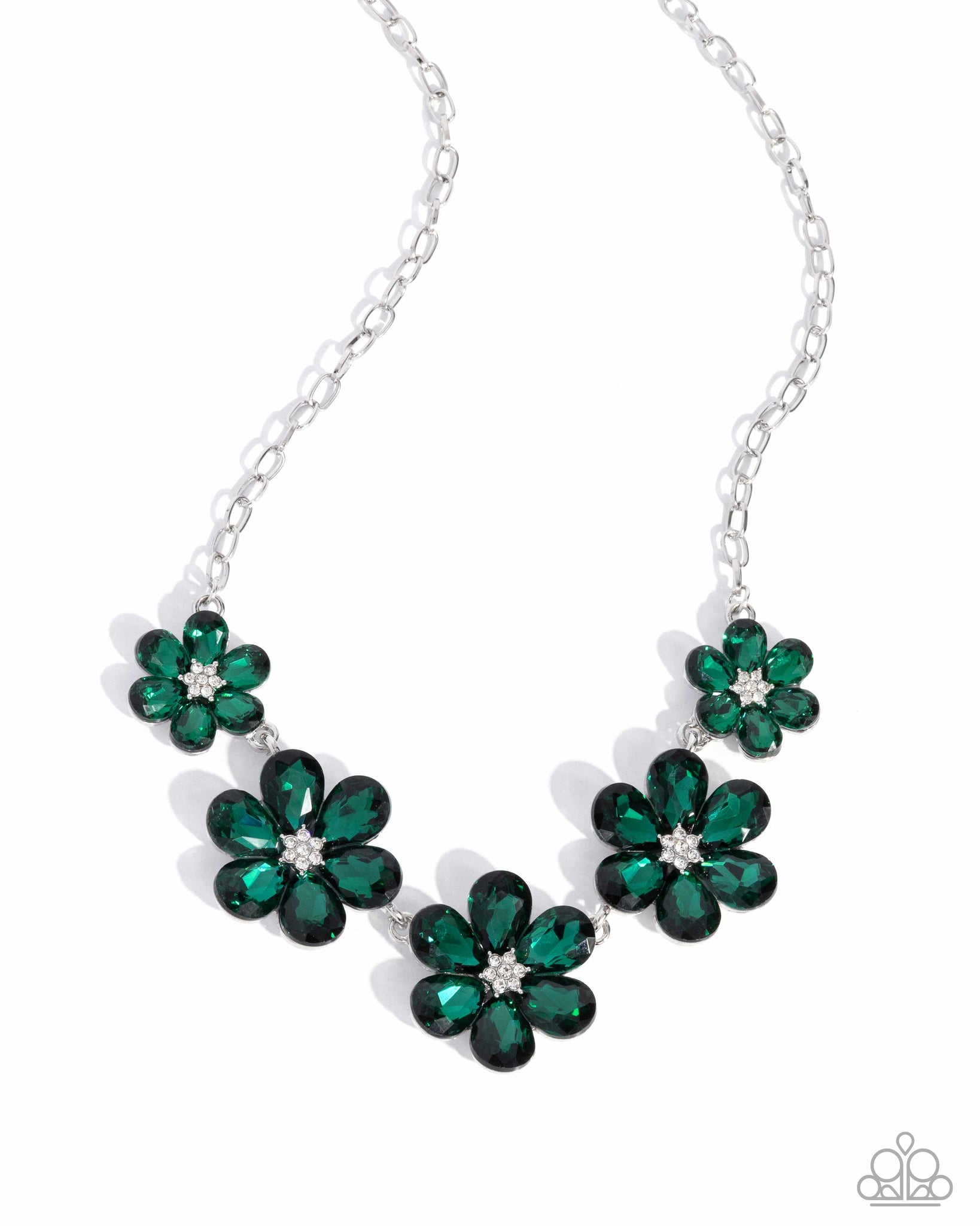Dotted with dainty white rhinestone floral centers, a flirtatious assortment of crystal-like emerald gem flowers gradually increase in size as they link below the collar from a silver cable chain for a playful pop of color. Features an adjustable clasp closure.